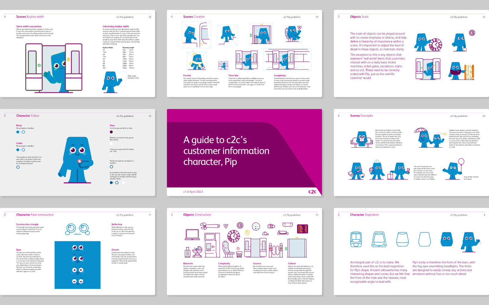 We designed a friendly, big-eyed character with the versatility to bring charm to a range of station and travel updates. We created a set of illustration guidelines showing how to use Pip, and their pals, along with any objects and props.