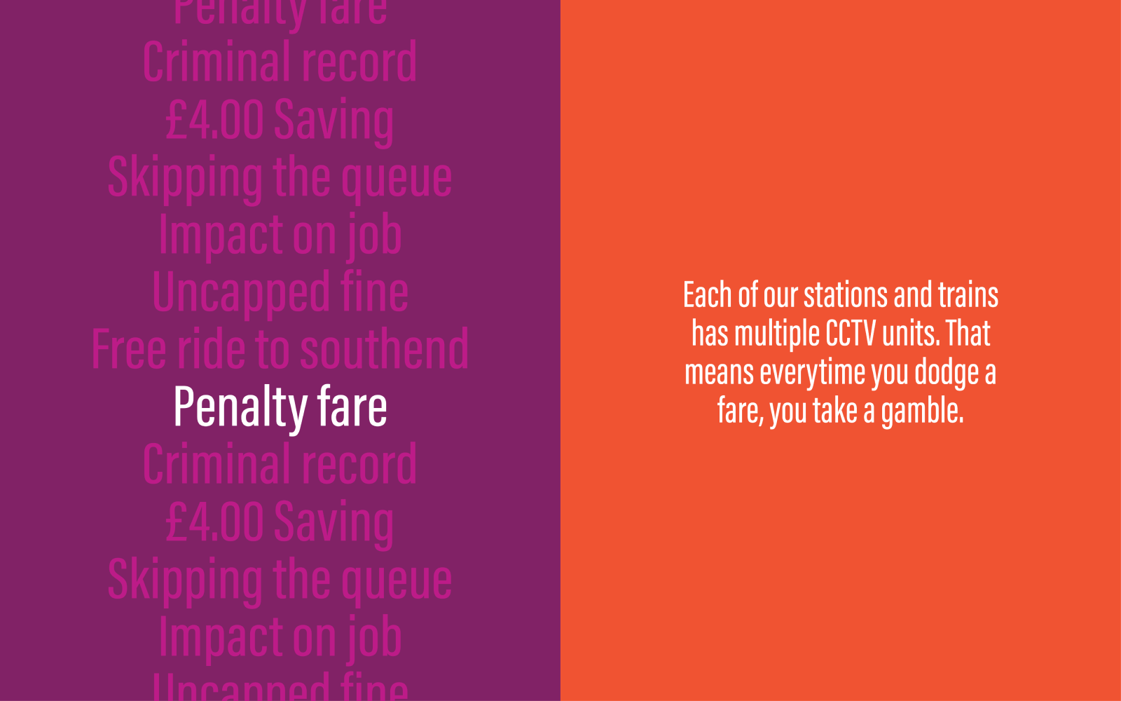 “We’re delighted to launch our new campaign which clearly highlights not only the impact fare-avoidance can have on the taxpayer but also the very real impact on the lives of those who are committing fraud for the sake of a ticket. The new creative from bandstand will be a welcome sight to our thousands of ticket-buying customers and at the same time demonstrates the clear message we have to those thinking about travelling without a ticket – it’s simply not worth the gamble.”