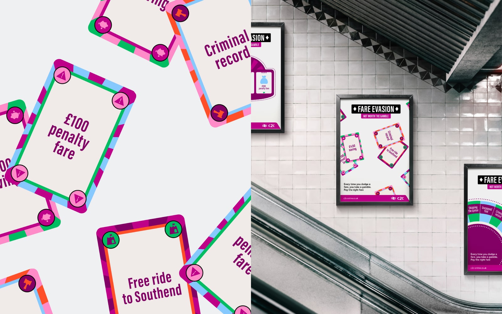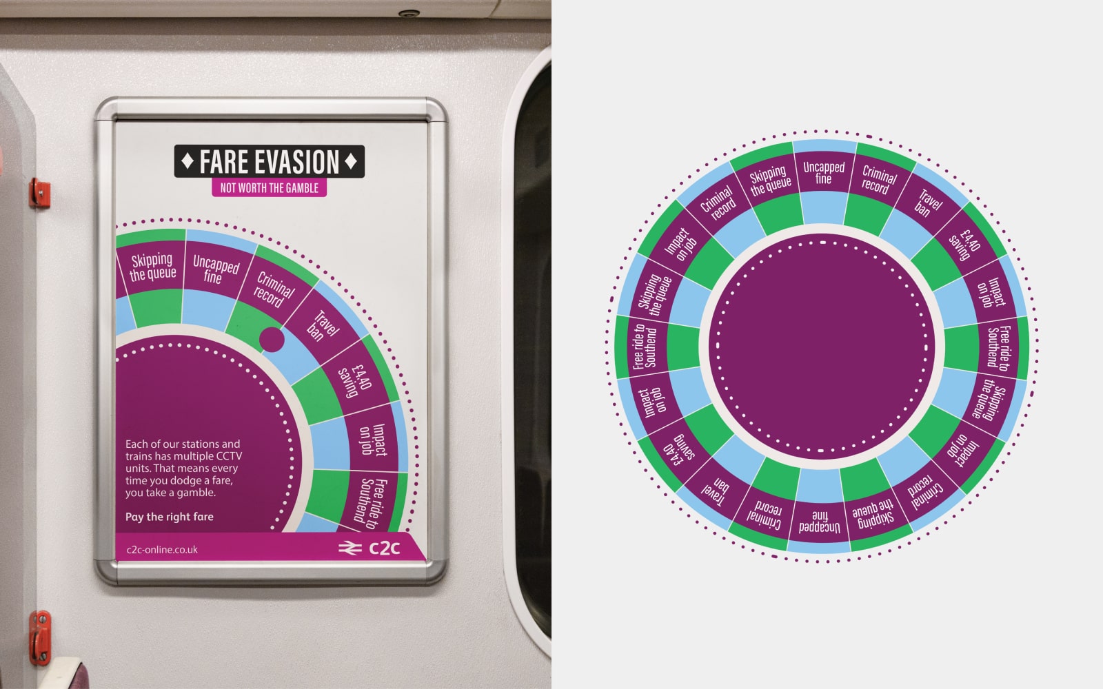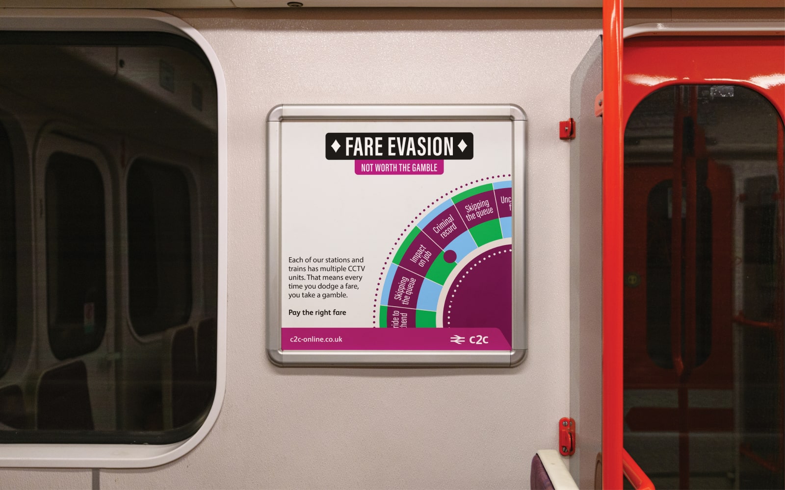 Train companies lose millions to fare evasion each year, so train company c2c asked us to whip up a campaign increasing awareness of the consequences. Since many people believe dodging fares is worth the risk, we devised bold, playful creative centred around the line “Not worth the gamble”, accompanied by hard-hitting and visual nods to the world of gambling. Cue eye-catching imagery of roulette wheels, playing cards and fruit machines to be displayed across the trains and stations along the London-Essex line.