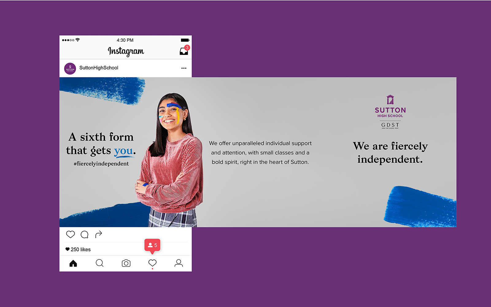 We created the idea of “Fiercely independent”. This encapsulated both the school’s independence and the fact that girls go there to find their own independence. bandstand organised and managed a photoshoot where each student wore bold face paint, representing their own self-expression, allowing their characters to really shine through. We captured poses that showed confidence, power and independence. The shoot delivered a bank of imagery that GDST Sutton could use throughout all comms.