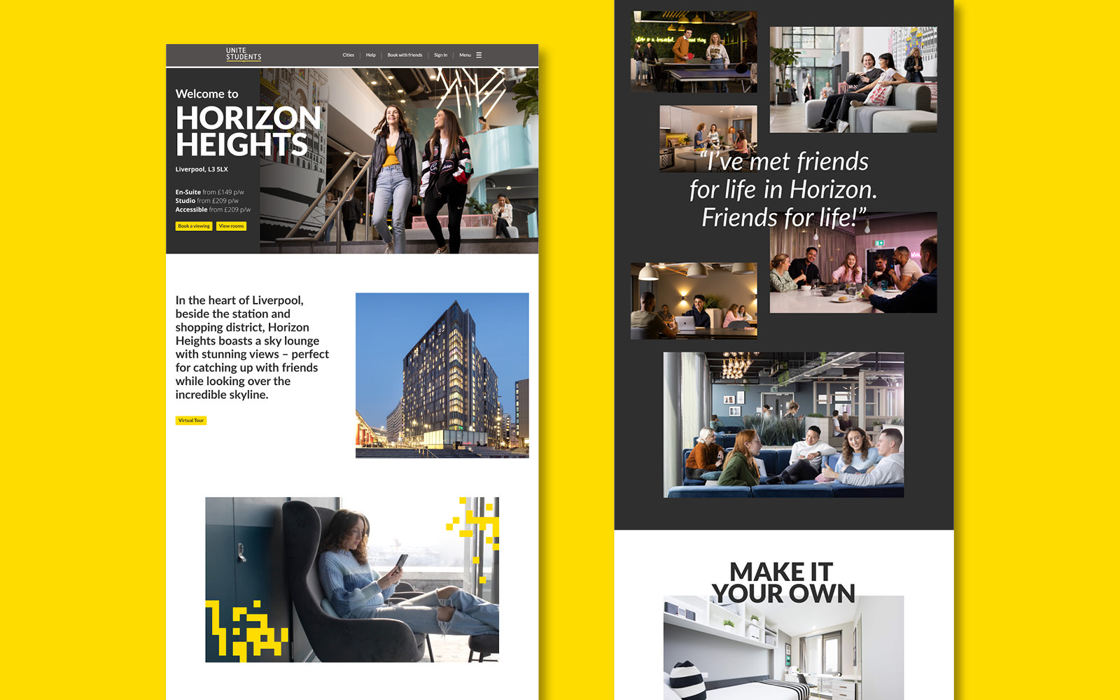 Unite Students needed to revitalise their digital content to inspire more students to live at their properties, positioning them as “homes for success”. We art-directed room designs and lifestyle images to create photography that felt warm and inviting. Picking props that were attainable for students and their budget was key to this project’s success. We also produced video testimonials that brought Unite Students’ brand positioning to life in an energetic and dynamic way.