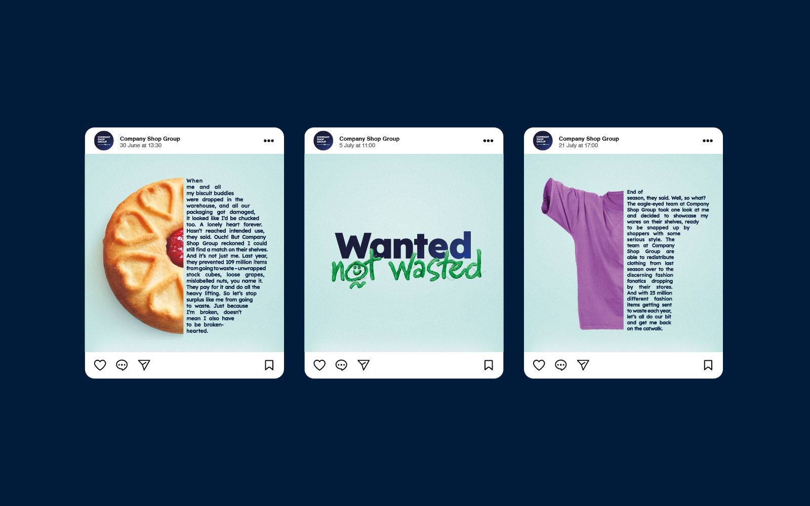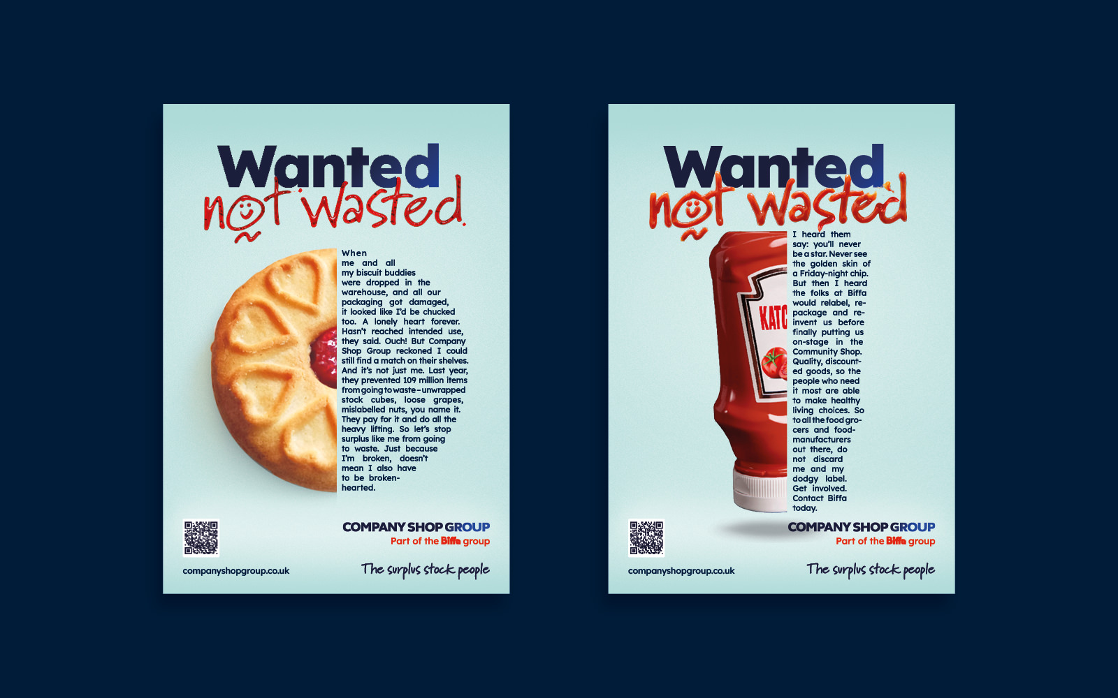 Using playful imagery of products from potato smileys to Jammie Dodgers, alongside fun copy, we highlighted how perfectly good surplus was being thrown out over issues such as weight and labelling. The copy emphasised how surplus could be redirected to Company Shops as discounted products to support those who need it most, helping communities, the environment and the businesses themselves via financial remuneration. Assets were rolled out across multiple channels including OOH, print and social.